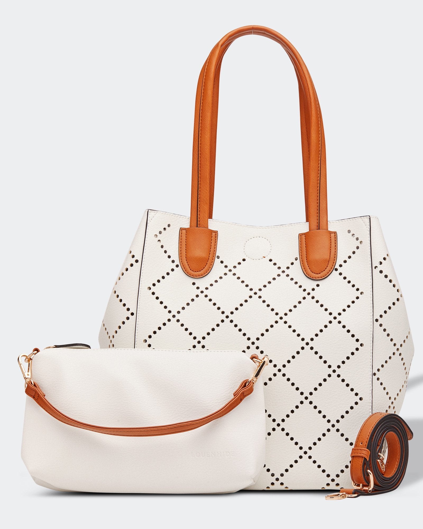 A signature Louenhide design, and our most popular bag of all time! This large tote with die-cut design includes a removable crossbody strap and extra purse.