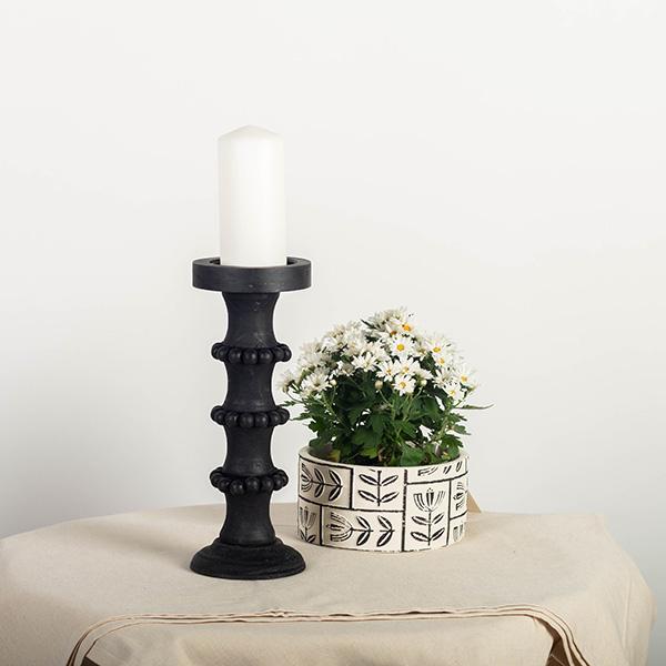 Stunning black candle holder that looks like a decorated column, with large beads wrapped around it. Classic Home style. 3 sizes available