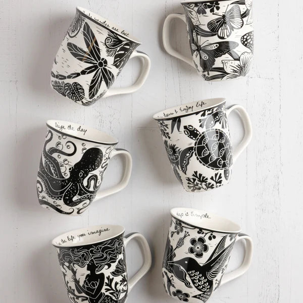 Uniquely illustrated and printed, these inspirational mugs are made for the bohemian in all of us, expressing ideas of love, adventure, music and artistic lifestyle. Available in multiple unique designs, these ceramic mugs are dishwasher friendly while each sip will inspire you for the next.