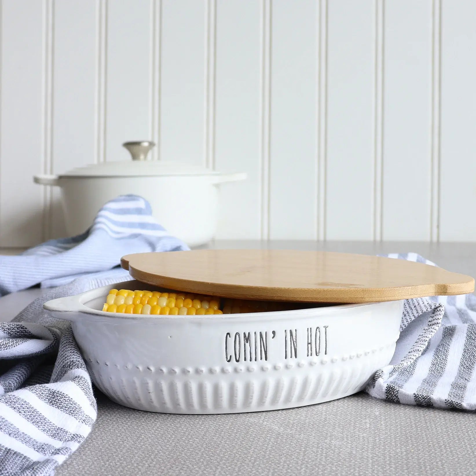 This ceramic oval dish with the sentiment "Comin In Hot" is perfectly suited for a variety of dips, sauces or appies.