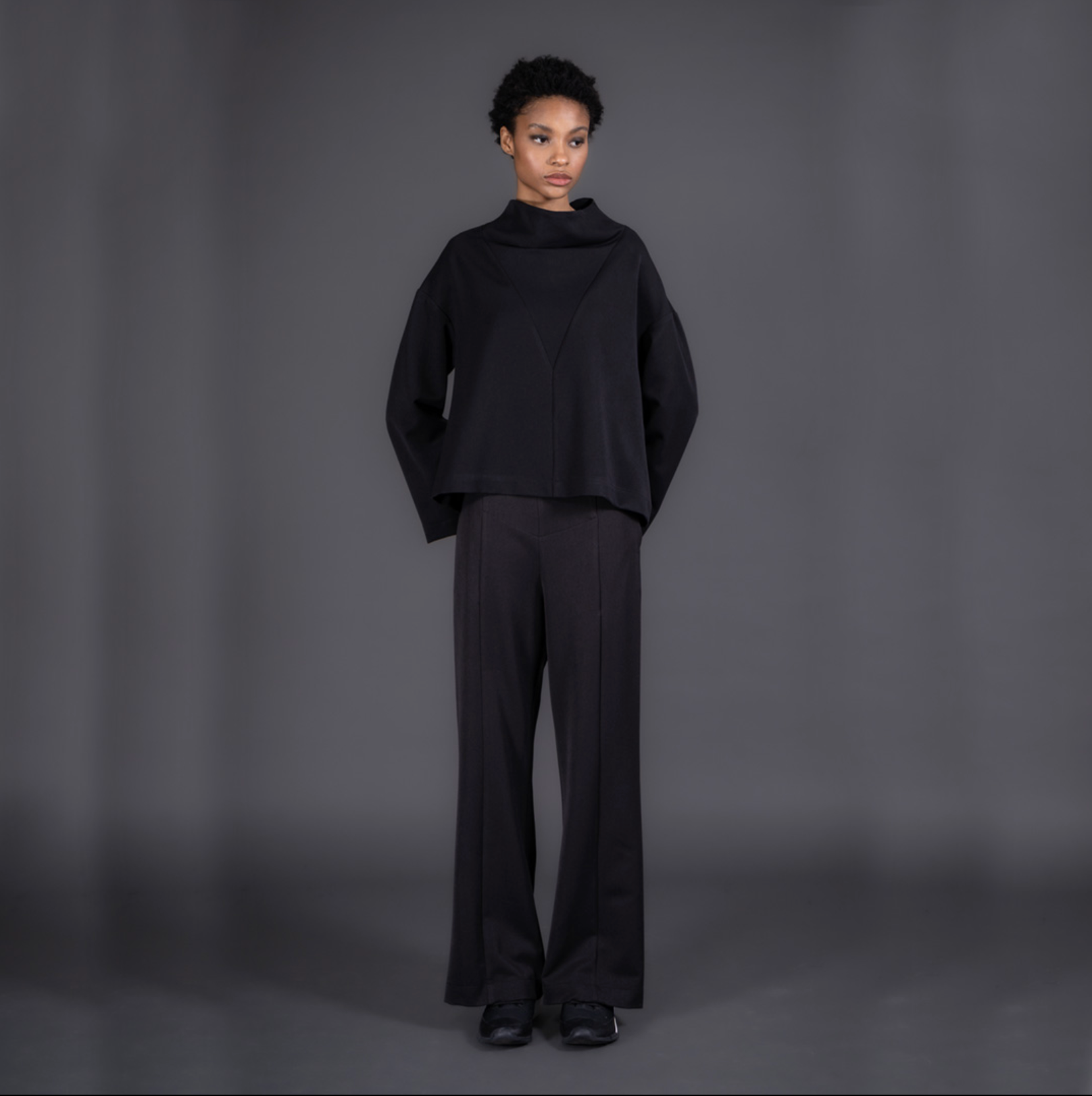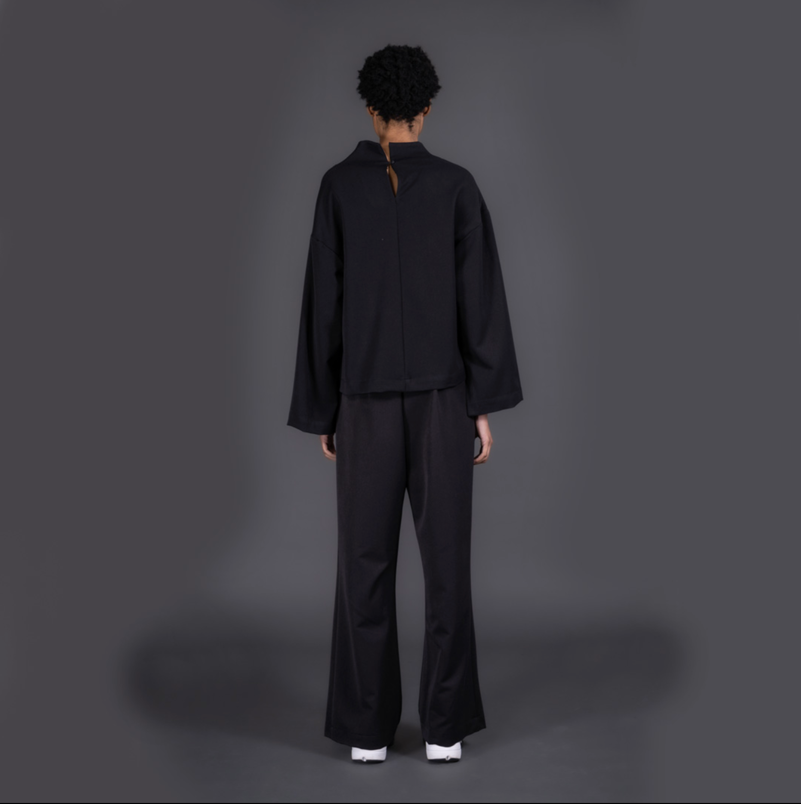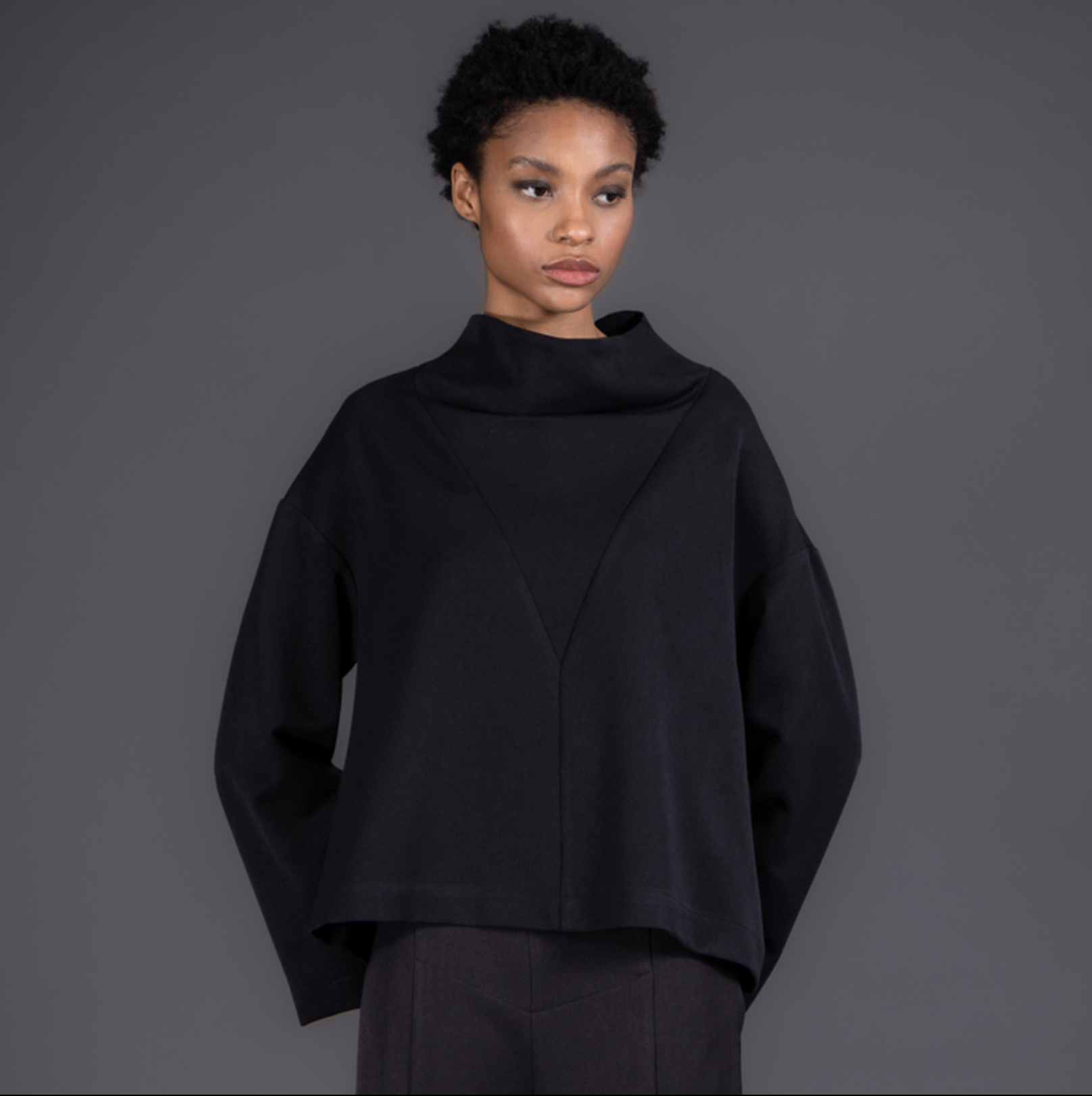 This mock neck top features a unique cut, wide slit sleeves and a button fastening.