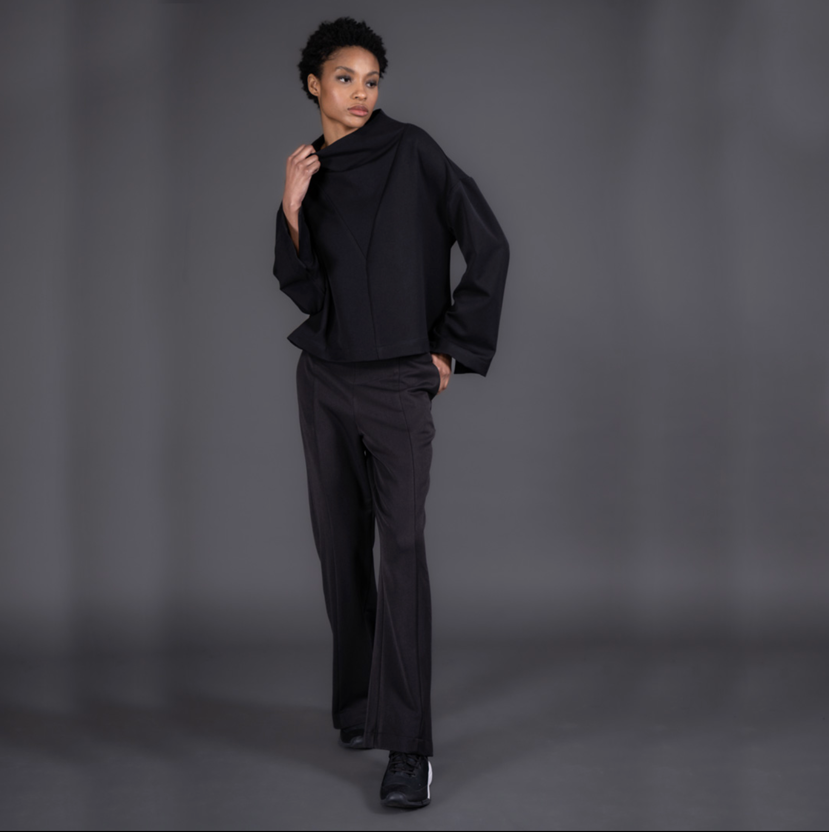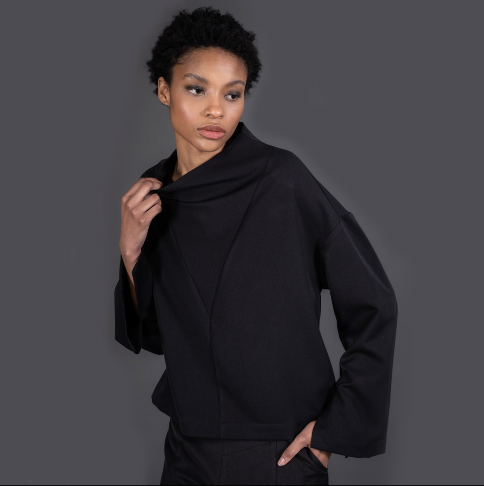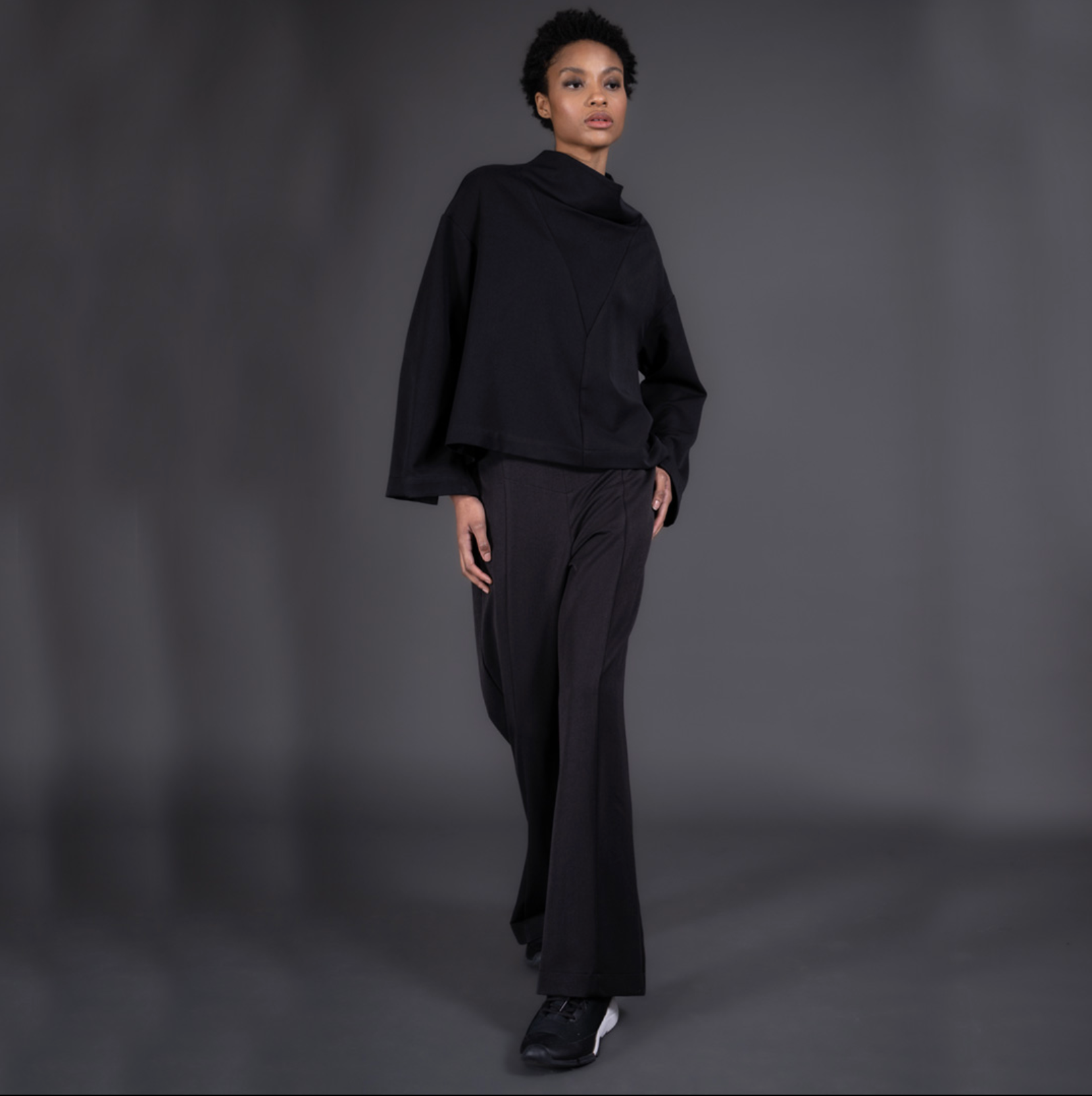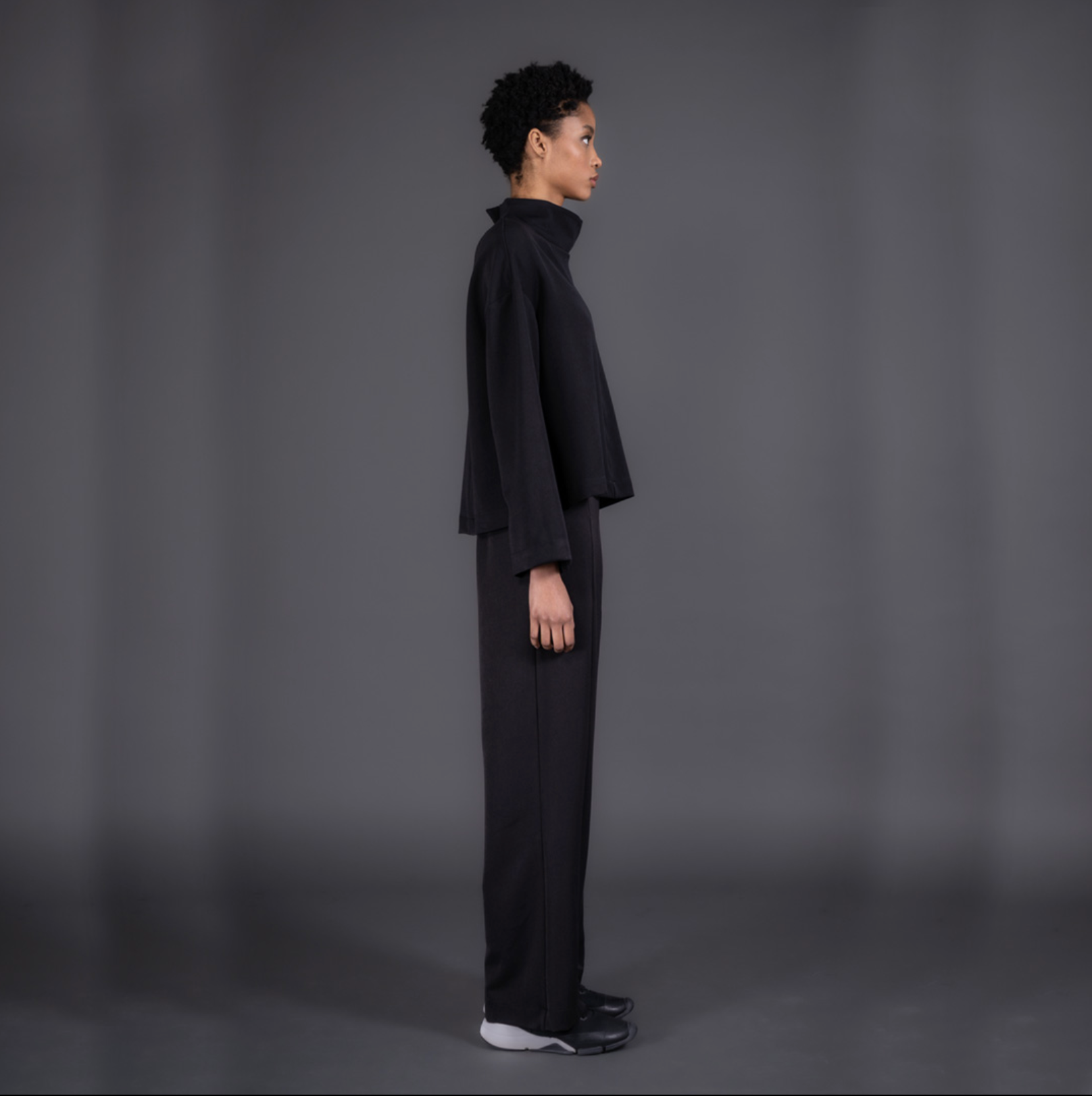 This mock neck top features a unique cut, wide slit sleeves and a button fastening.