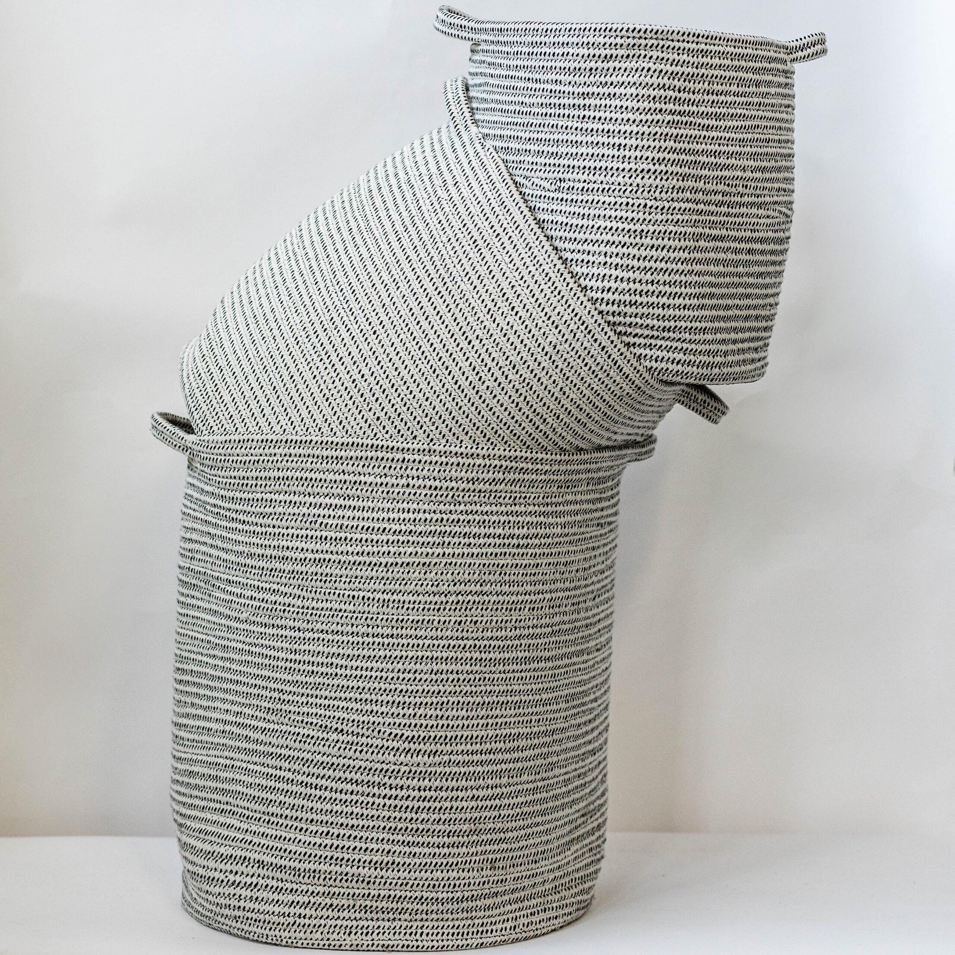 These versatile cotton textured baskets have handles and come come in 3 sizes. The black/white colour is an easy fit in any decor. The small basket is 10.5"x10.5"