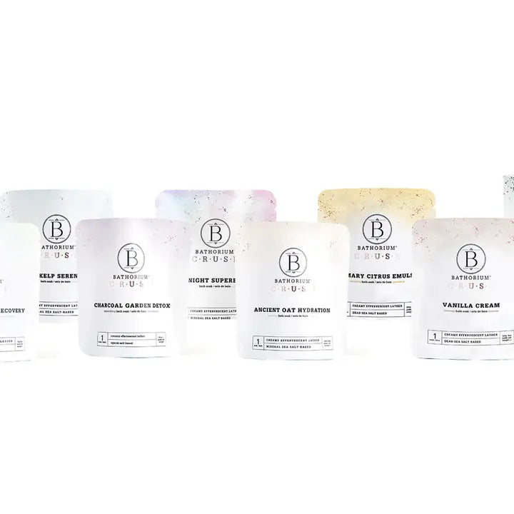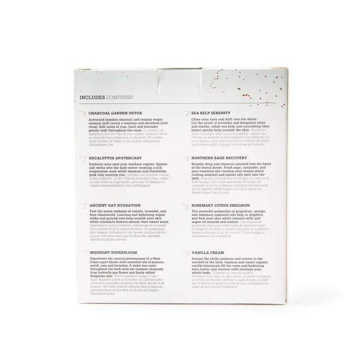 Includes: One 120g sachet of: Ancient Oat Hydration Crush Soak Sea Kelp Serenity Crush Soak Charcoal Garden Detox Crush Soak Northern Sage Recovery Crush Soak Eucalyptus Apothecary Crush Soak Midnight Superbloom Crush Soak Rosemary Citrus Emulsion Crush Soak *exclusive!* Vanilla Cream Crush Soak exclusive!