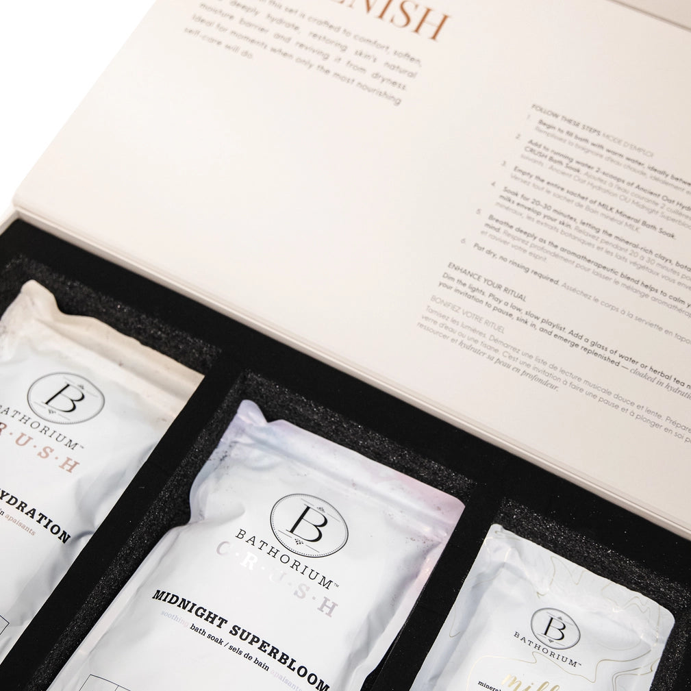 Wrap yourself in the deepest form of hydration with this curated set designed for the ritualist at heart. Featuring three of our most moisturizing bath soaks and our signature Bathorium™ Bamboo Scoop, this collection transforms your bath into a skin-loving sanctuary. What's