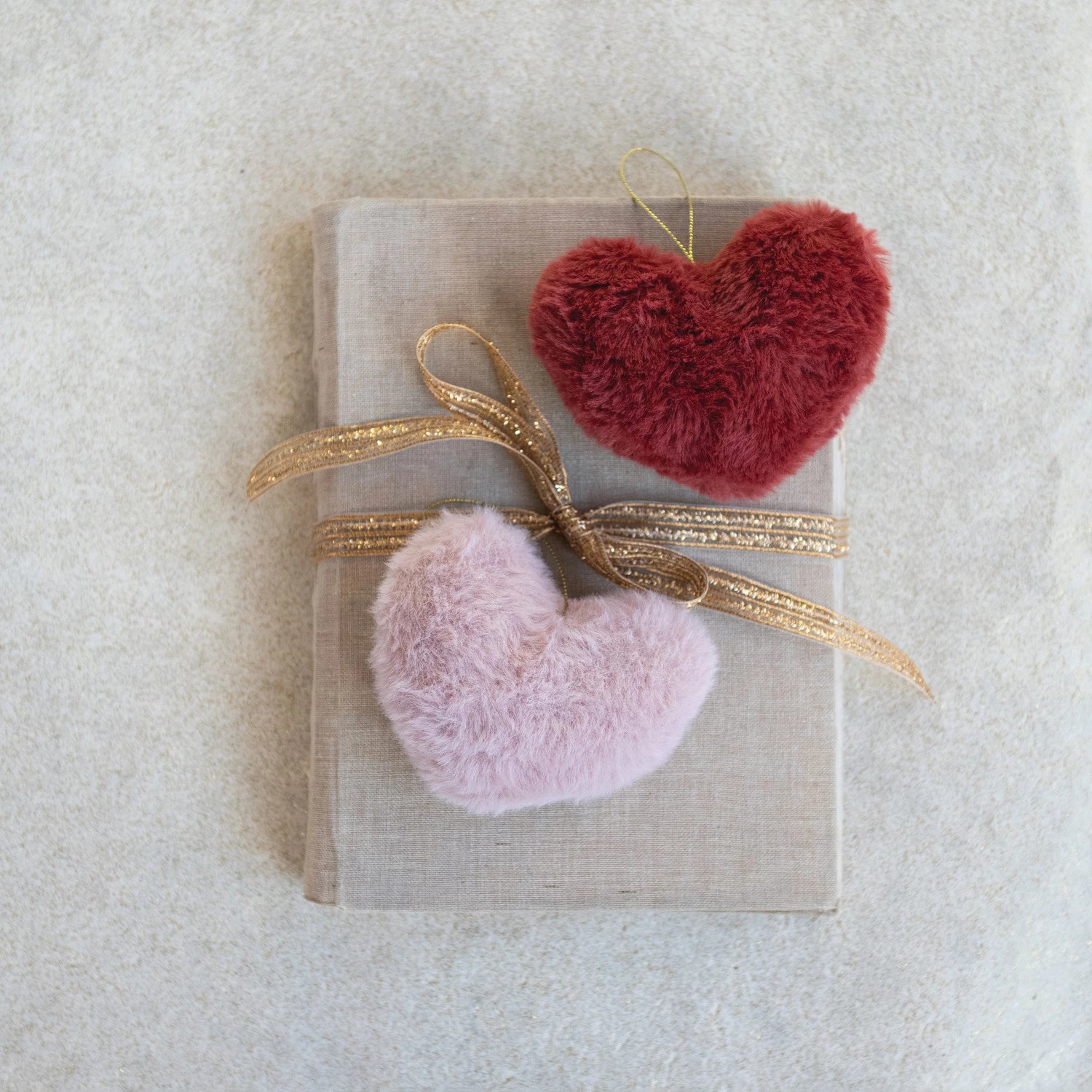 Adorable faux fur heart ornaments in either pink or red, sure to add some cuteness to your holiday decor.