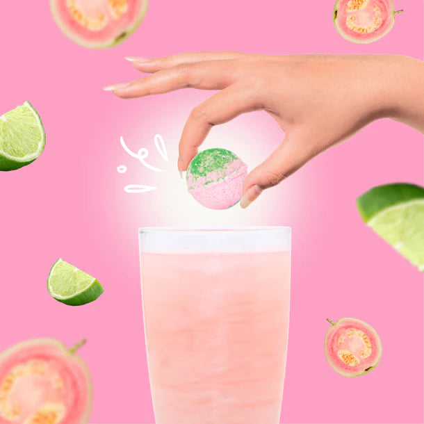 - Add the GUAVA LIME GLIMMER BOMB™ and watch it fizz