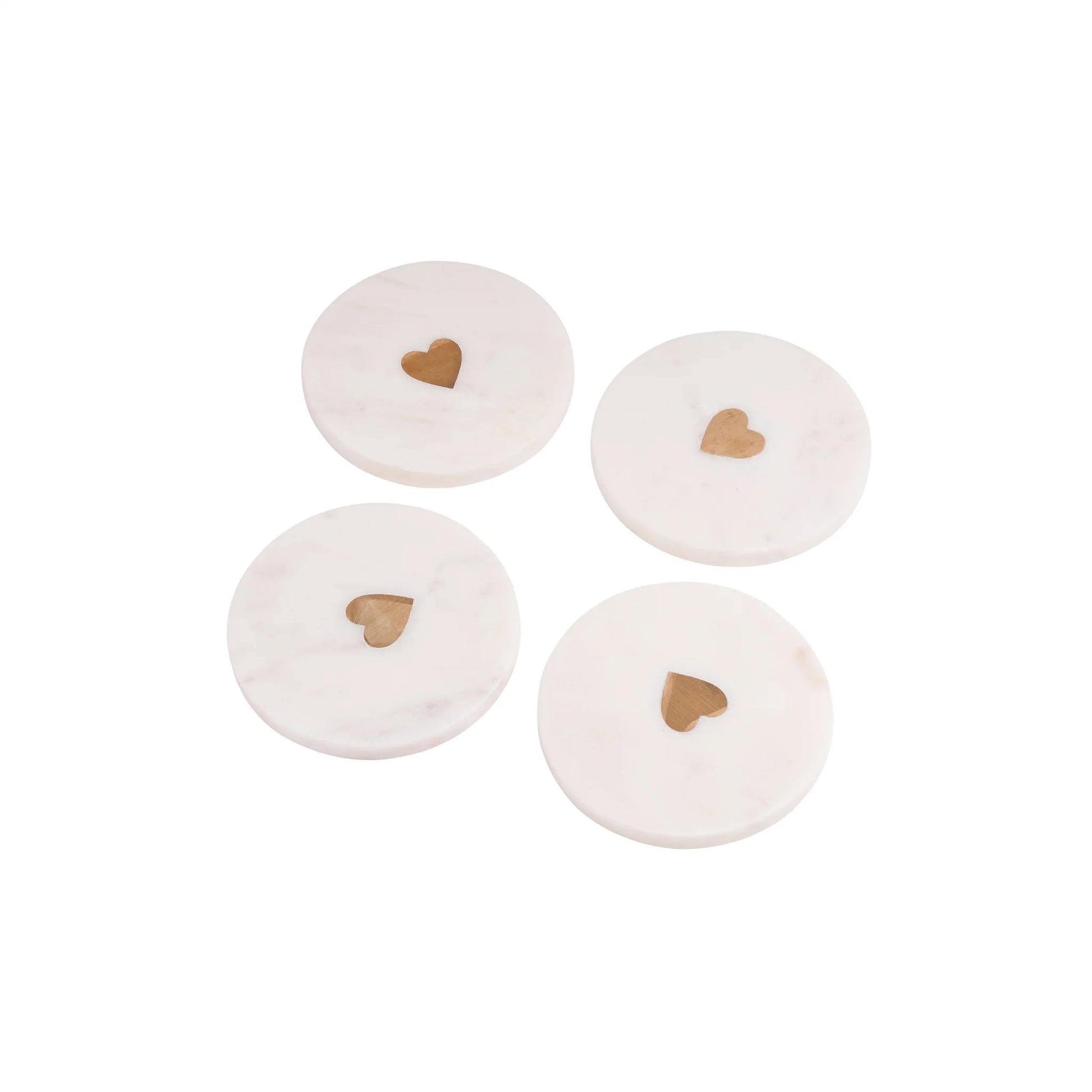 The Aquila heart marble coasters, crafted from premium white marble and accented with brass, offer a blend of elegance and utility. Their heart-shaped brass inserts add a touch of charm, making them a stylish accessory for any table setting. The smooth marble surface provides excellent protection for surfaces, while the brass detailing adds a hint of luxury. Perfect for both everyday use and special occasions, these coasters complement a variety of decor styles. Handcrafted with care, they make an exquisite gift or a sophisticated addition to your home., 4.25x4.25x0.6", White, Marble/Brass