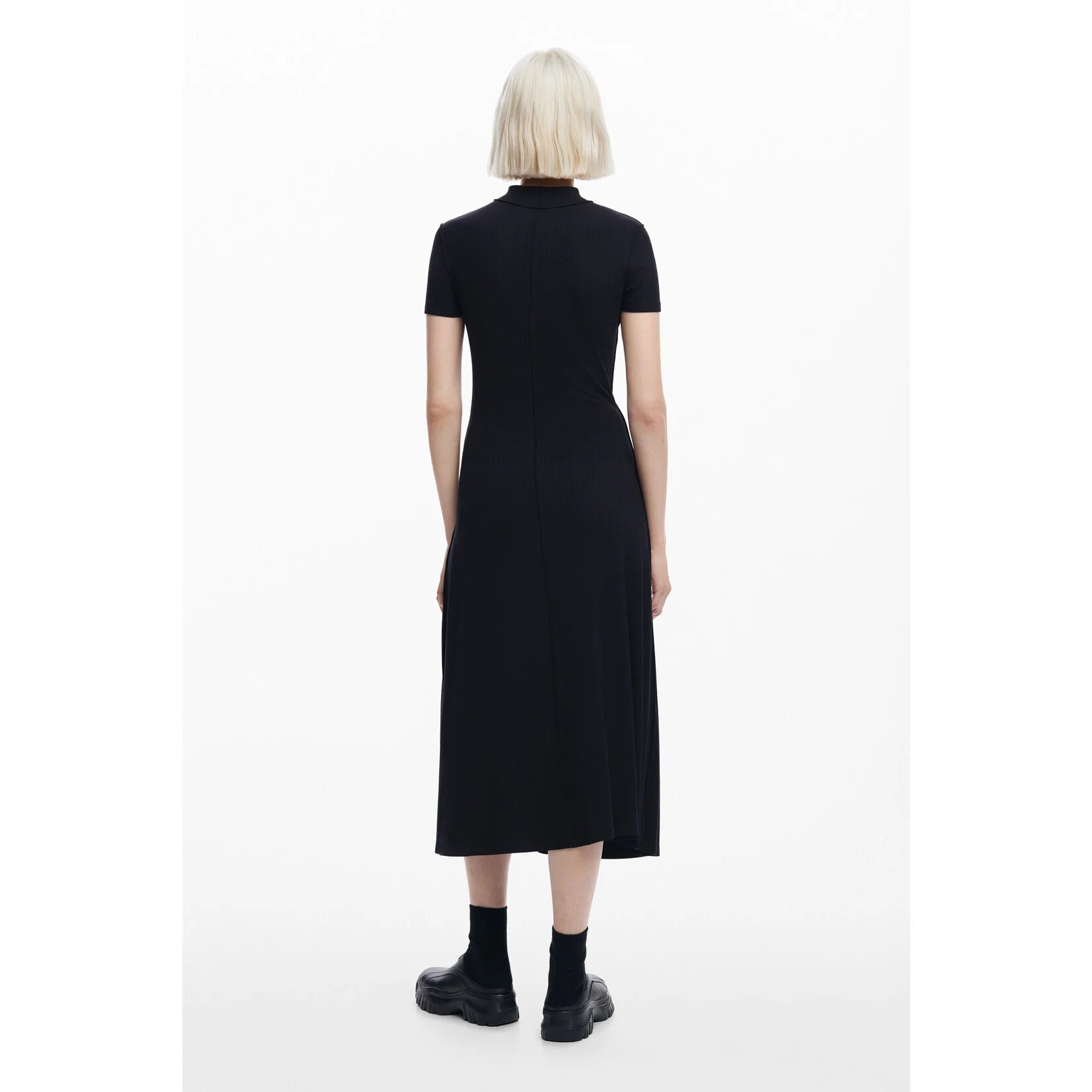 Fitted midi dress with short sleeves, mock neck, and seamed details.
