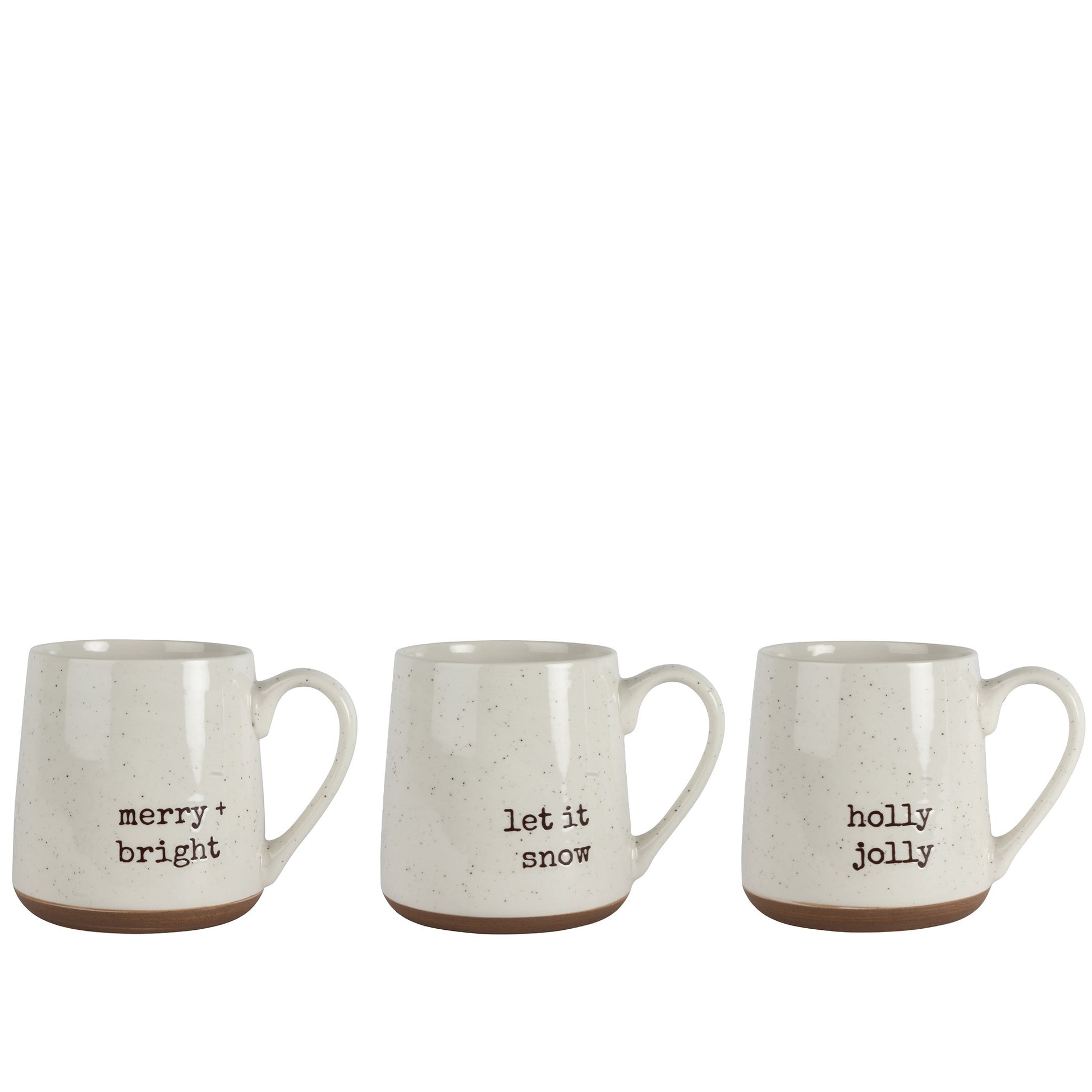 SIP YOUR FAVORITE BEVERAGES WITH THIS SET OF THREE SPECKLED CERAMIC MUGS, FEATURING WINTER PHRASES TO BRING A FESTIVE SPIRIT TO YOUR DRINKS. THE RUSTIC SPECKLED FINISH ADDS A CHARMING, TEXTURED ELEMENT TO YOUR HOLIDAY TABLESETTING.