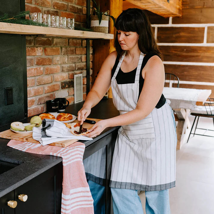 This Apron is designed to elevate any kitchen theme, with its neutral-toned black/white stripe pattern and quick-drying 100% cotton. The Homestead Collection is the perfect kitchen set for baking, cooking, and brings an element of fine dining.