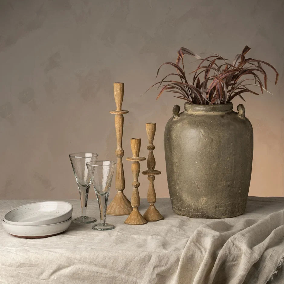 Elevate your tablescape with the hand forged aluminum Imani Candle Holder, handmade in Moradabad, a city in India celebrated for its metal craftsmanship. The creamy neutral powder coating seamlessly combines contemporary flair with traditional manufacturing techniques, resulting in a stunning matte finish that exudes dramatic character. Add a sense of romance and occasion to everyday evenings by lighting candles at dinnertime, or by curating a vignette with a mix of sizes on a side console. The Dune finish is weathered and earthy, bringing a welcome organic feel to the home.