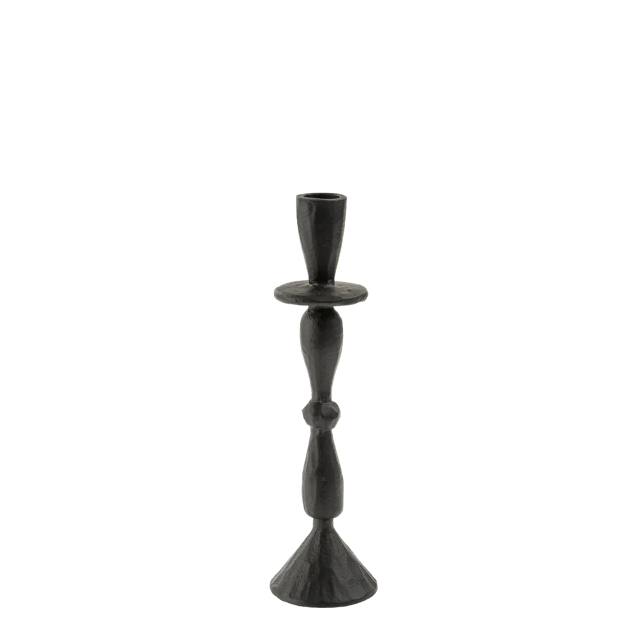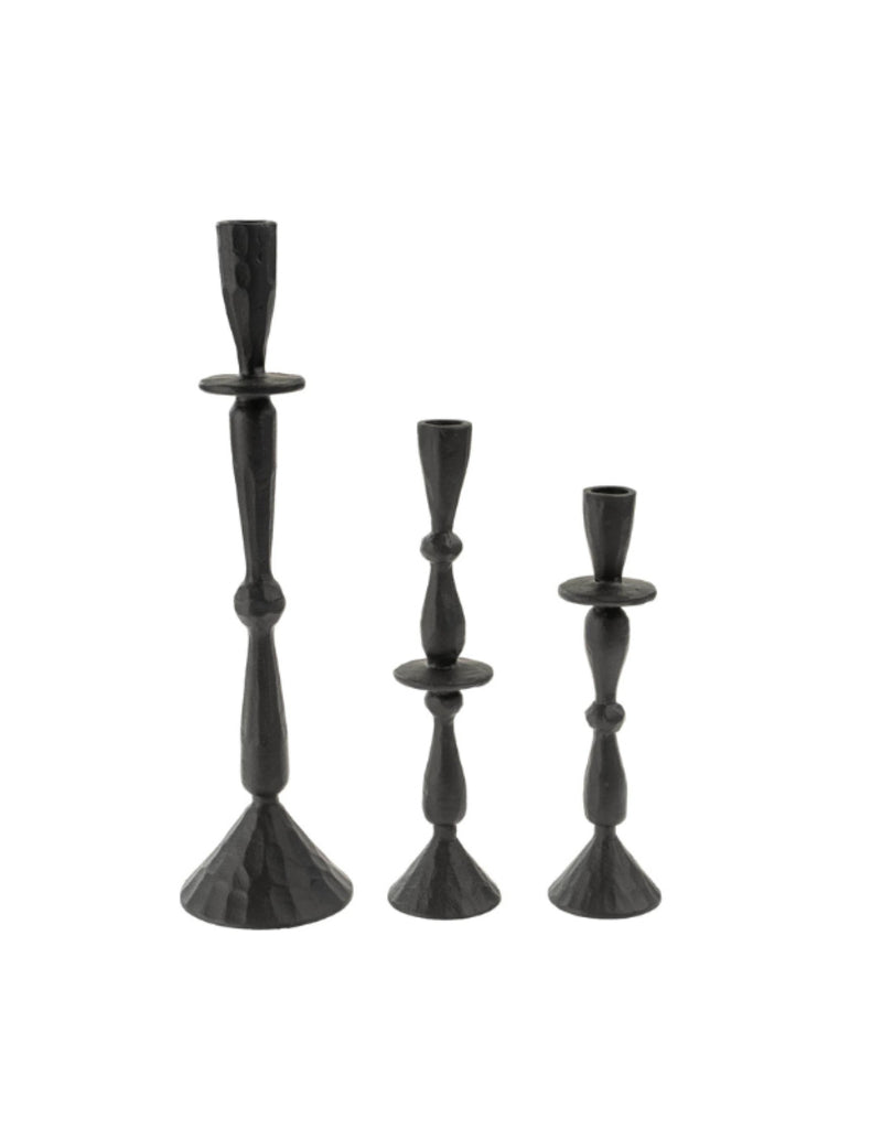 Elevate your tablescape with the hand forged aluminum Imani Candle Holder, handmade in Moradabad, a city in India celebrated for its metal craftsmanship. The black powder coating seamlessly combines contemporary flair with traditional manufacturing techniques, resulting in a stunning matte finish that exudes dramatic character. Add a sense of romance and occasion to everyday evenings by lighting candles at dinnertime, or by curating a vignette with a mix of sizes on a side console.