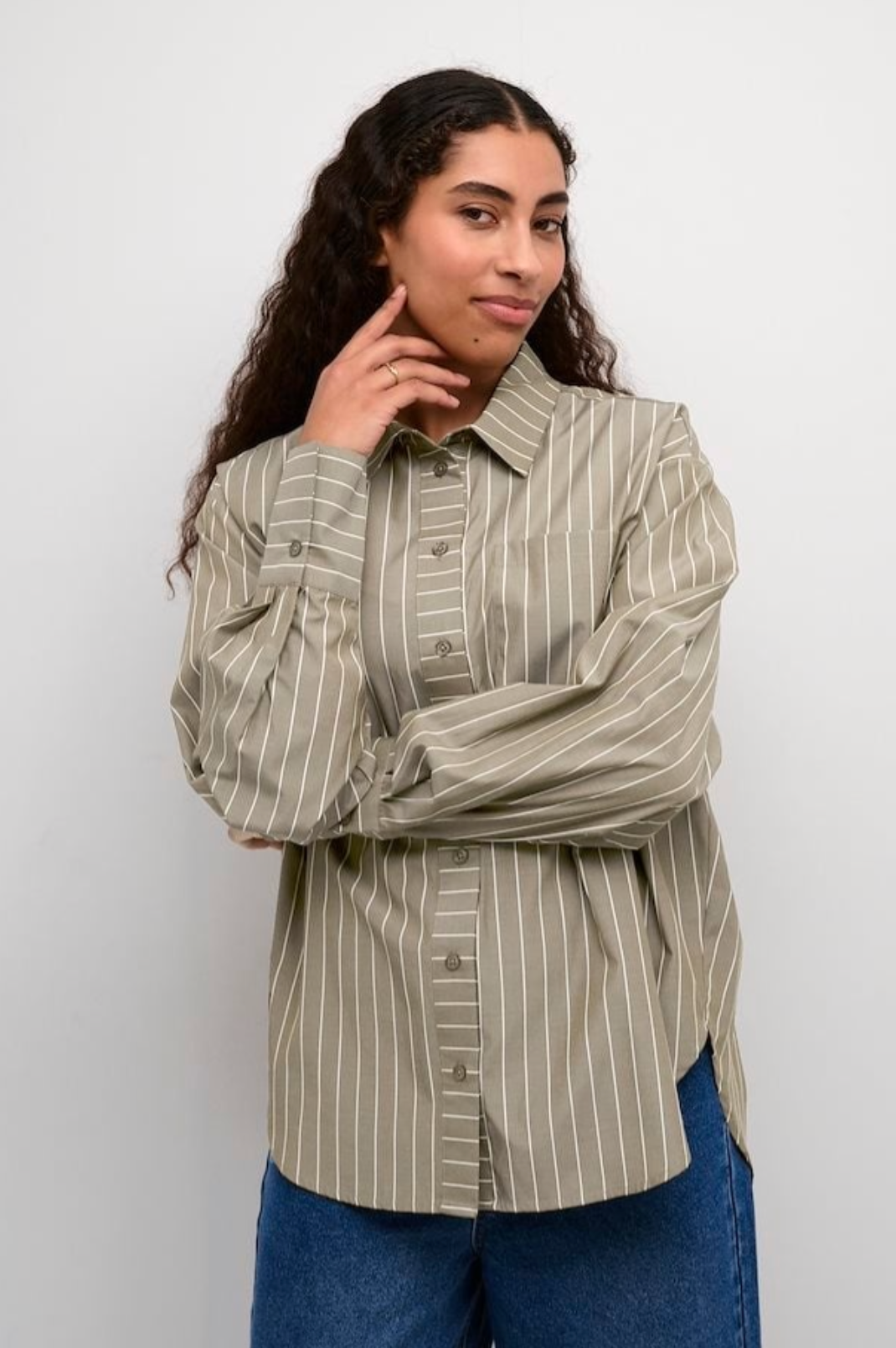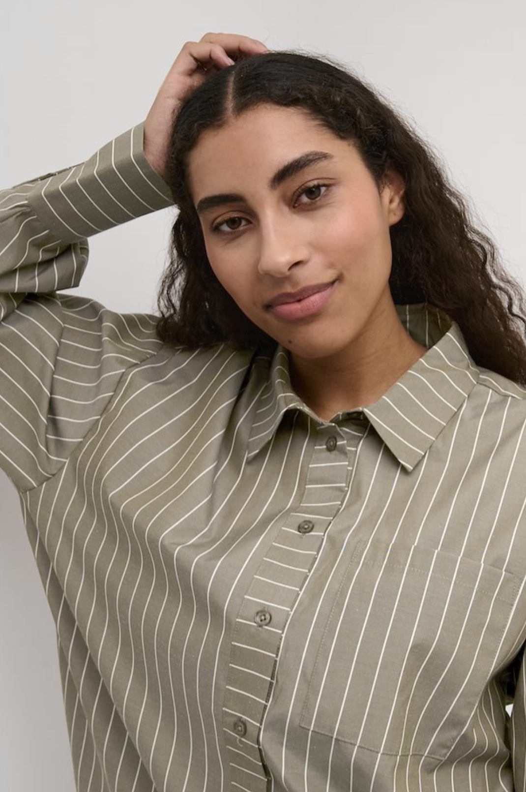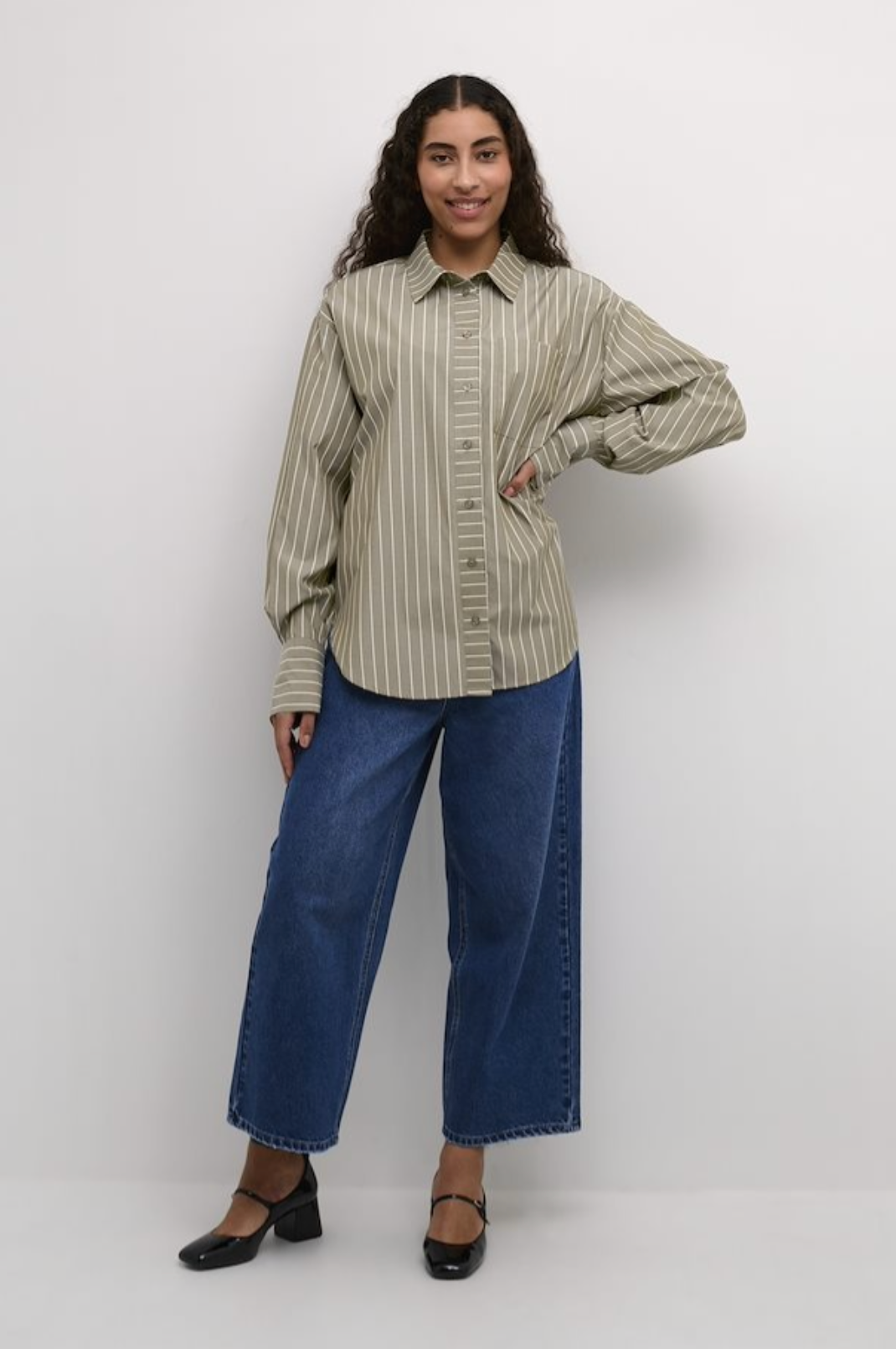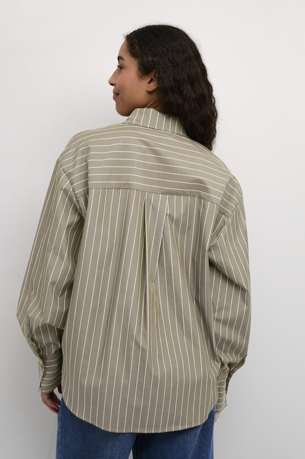 This oversized striped shirt features a classic collar, long sleeves, and a drop shoulder design. Perfect for a relaxed, casual look in neutral tones.