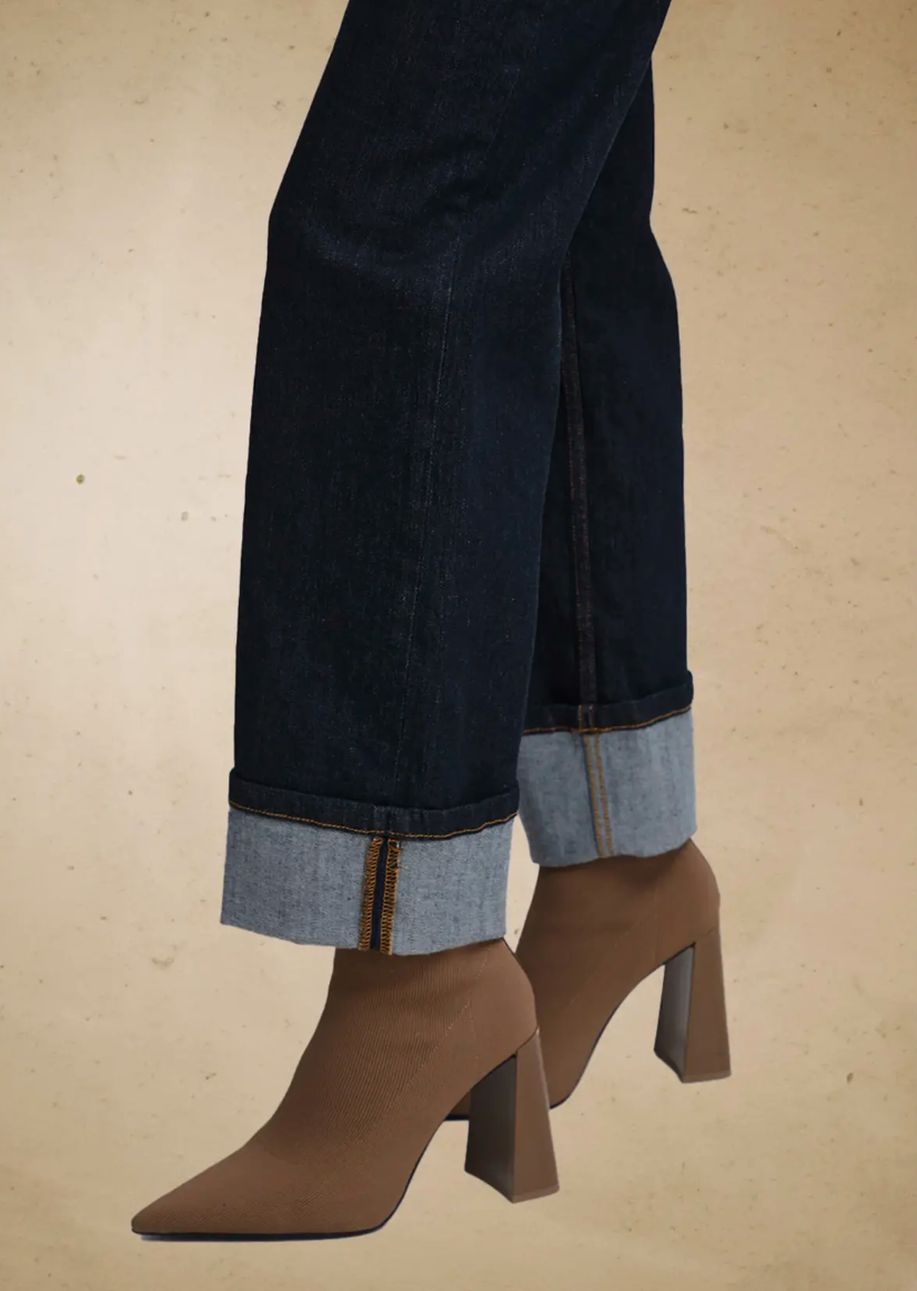 Dark Denim high waisted jean. Straight leg, cuffed hem.