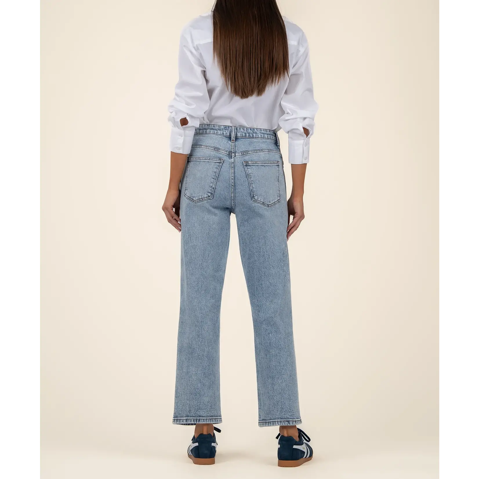 These jeans are the perfect blend of comfort and classic style. Featuring a high rise and straight leg cut, they offer a flattering fit that’s both chic and comfortable.