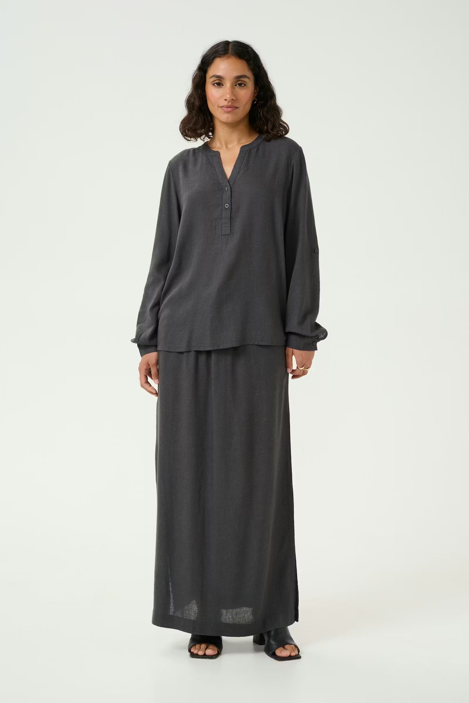 Lightweight blouse with a relaxed fit, featuring a V-slit neckline with button placket and long roll-tab sleeves. The rounded hem complements the fluid drape and versatile design.