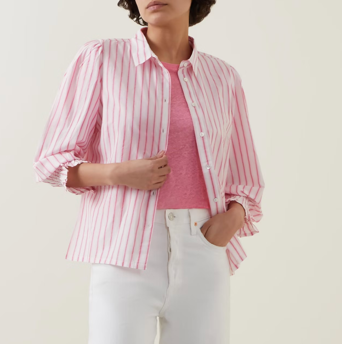 This button down shirt features a pointed collar, 3/4 length puff sleeves with elasticated frill cuffs, and a pink striped pattern.