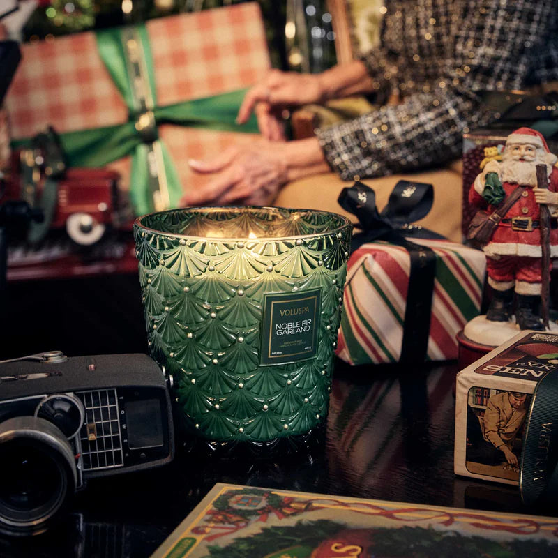 The centerpiece of celebration, the tree, reaches out with fragrant branches of Noble Fir and Cedarwood, dusted with festive Cardamom spice. Adorned in the spirit and sparkle of the holidays, a tapestry of Cashmere Musk and Warm Amber lights cast shadows dancing into the morning light. The Holidays have arrived..