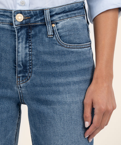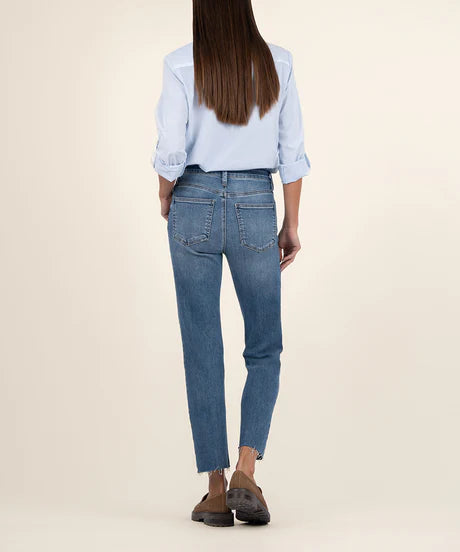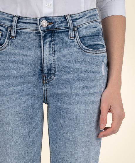 Refresh your wardrobe with jeans flaunting a high waist with Fab Ab, raw hems and tapered legs for a retro-inspired silhouette.