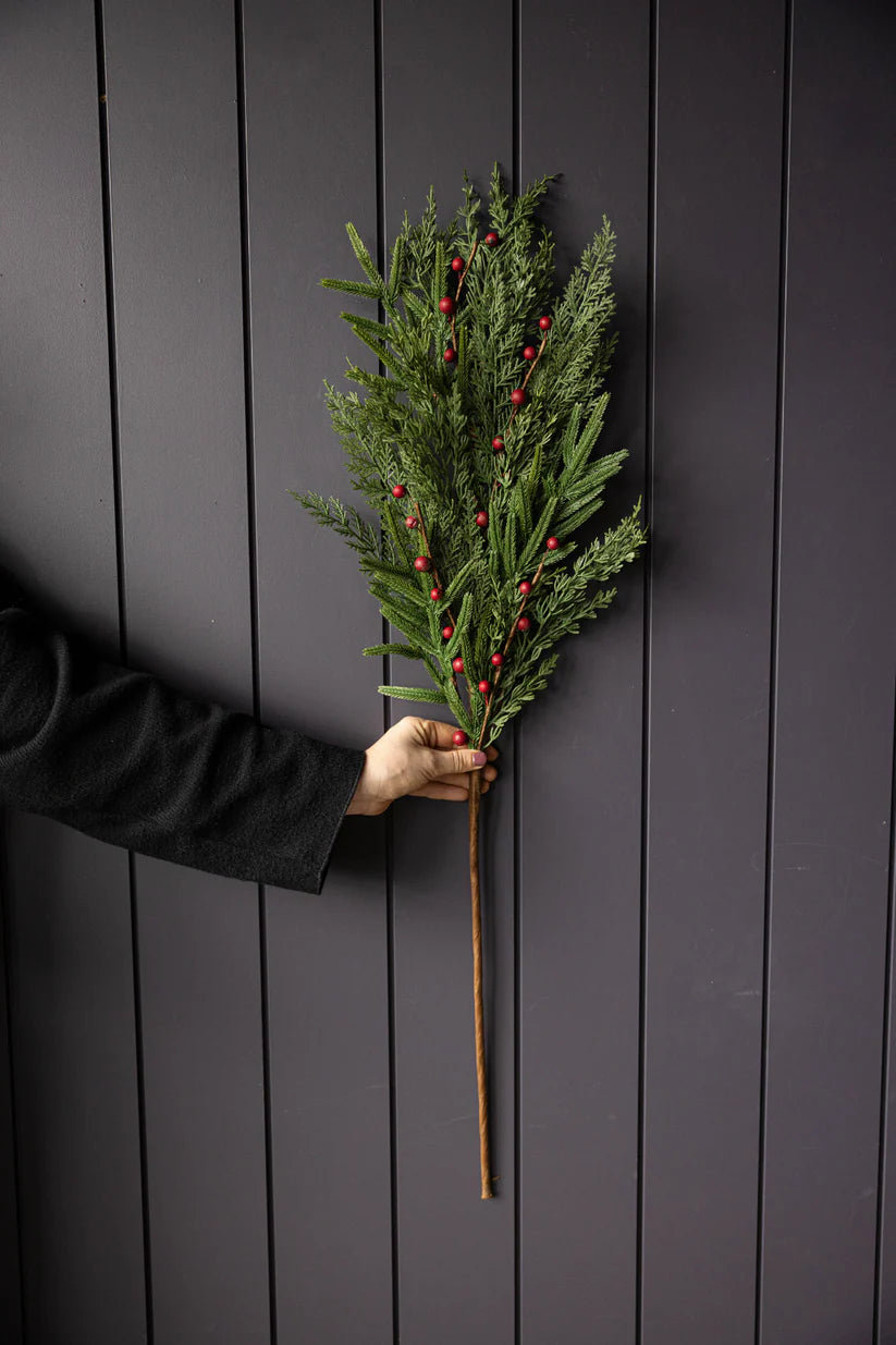 Red Plum Berry Norfolk Cypress Touch Green Faux Stem Branches by Luxe B Co. is a high-quality, realistic holiday decoration option. It comes in three sizes: Small Stem- 22”, Medium Stem- 28”, Large Stem- 42”