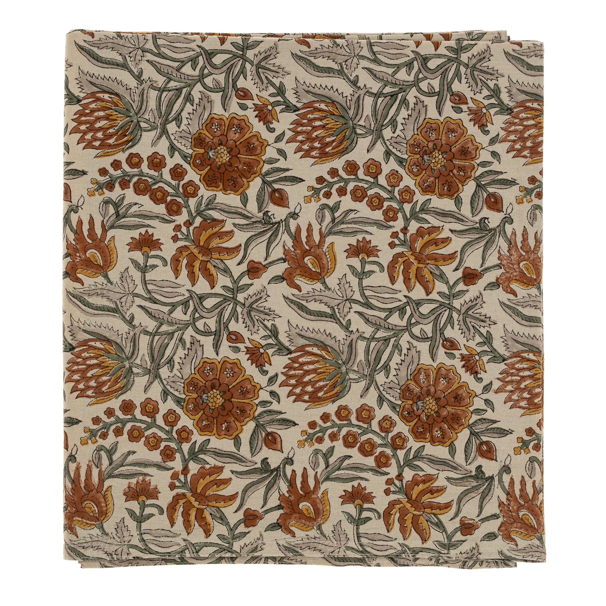 Enhance your dining experience with the Rosalind Block Print Tablecloth. Featuring rich fall-inspired hues, this tablecloth is hand block printed using traditional techniques, making each piece unique. Perfect for everyday meals and festive gatherings, adding a touch of artisanal beauty to every occasion.