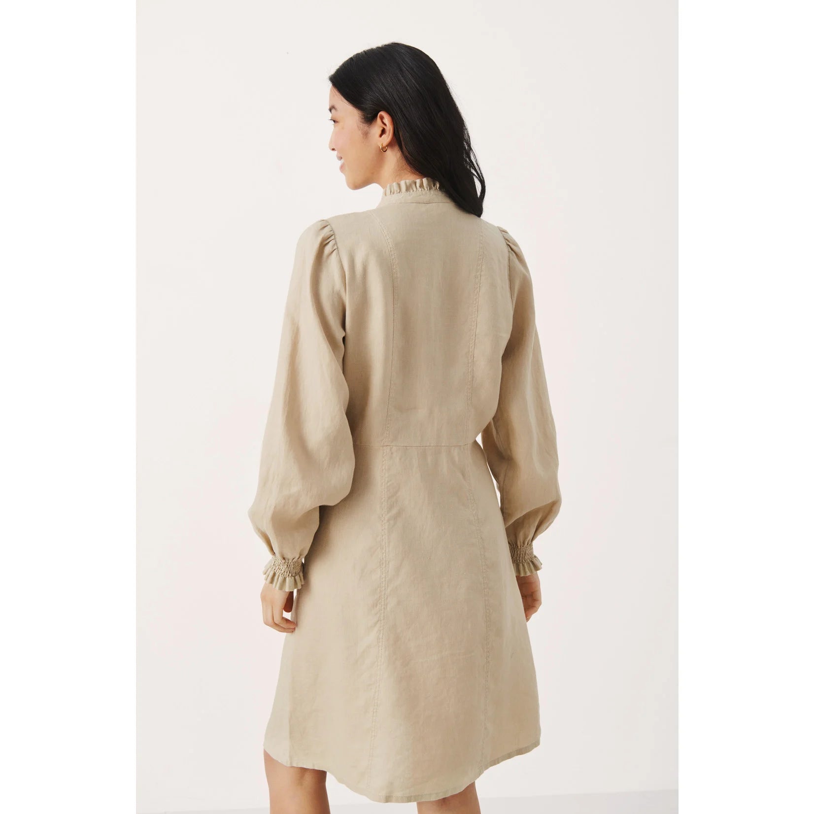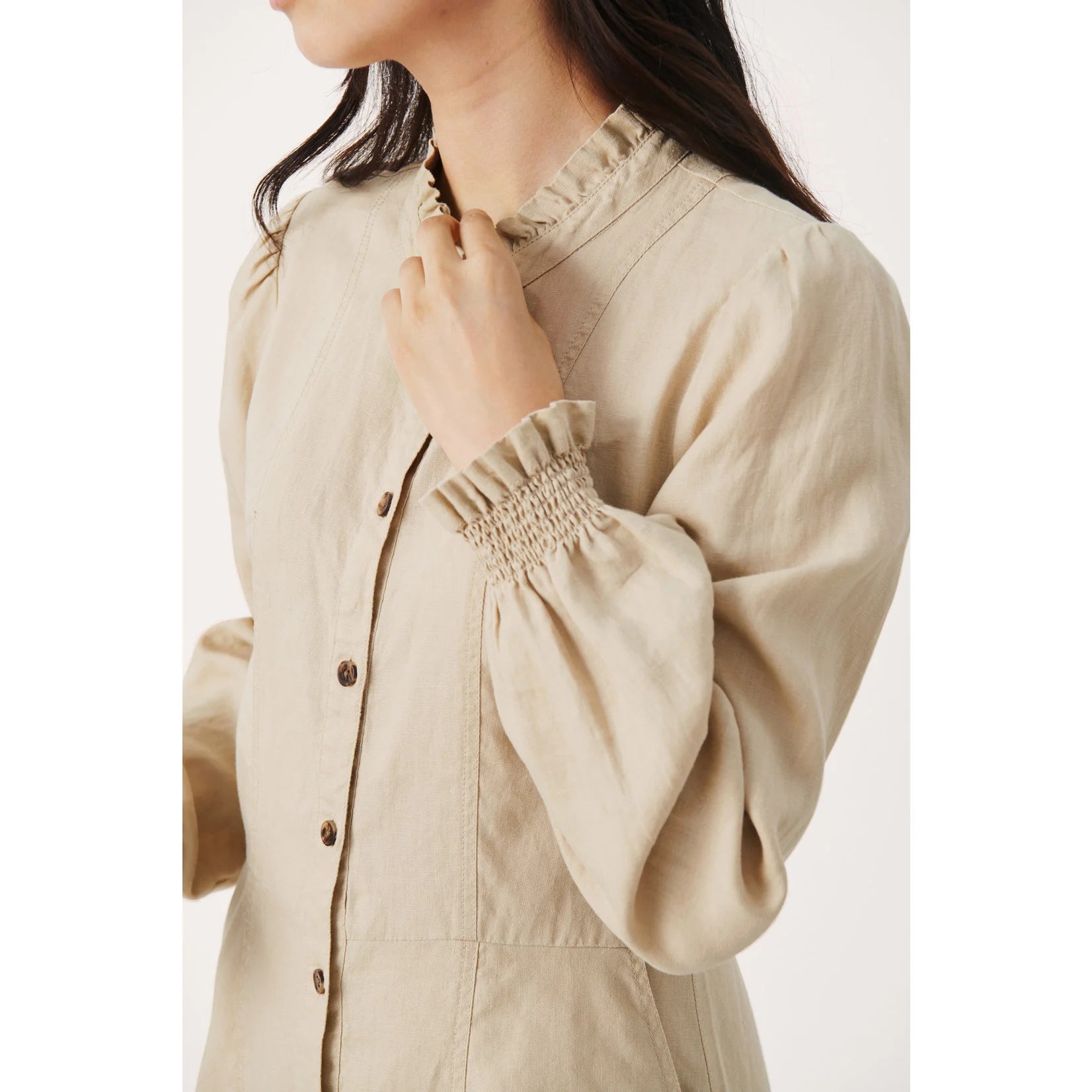 This button-up dress has smocked sleeve cuffs + ruffle detailing.