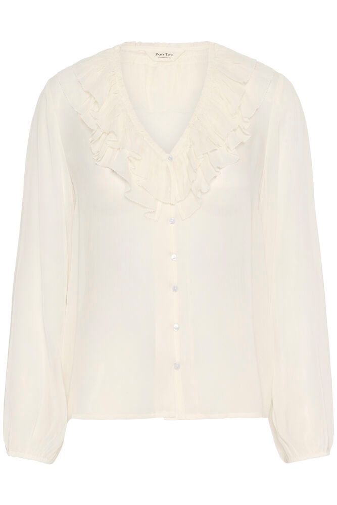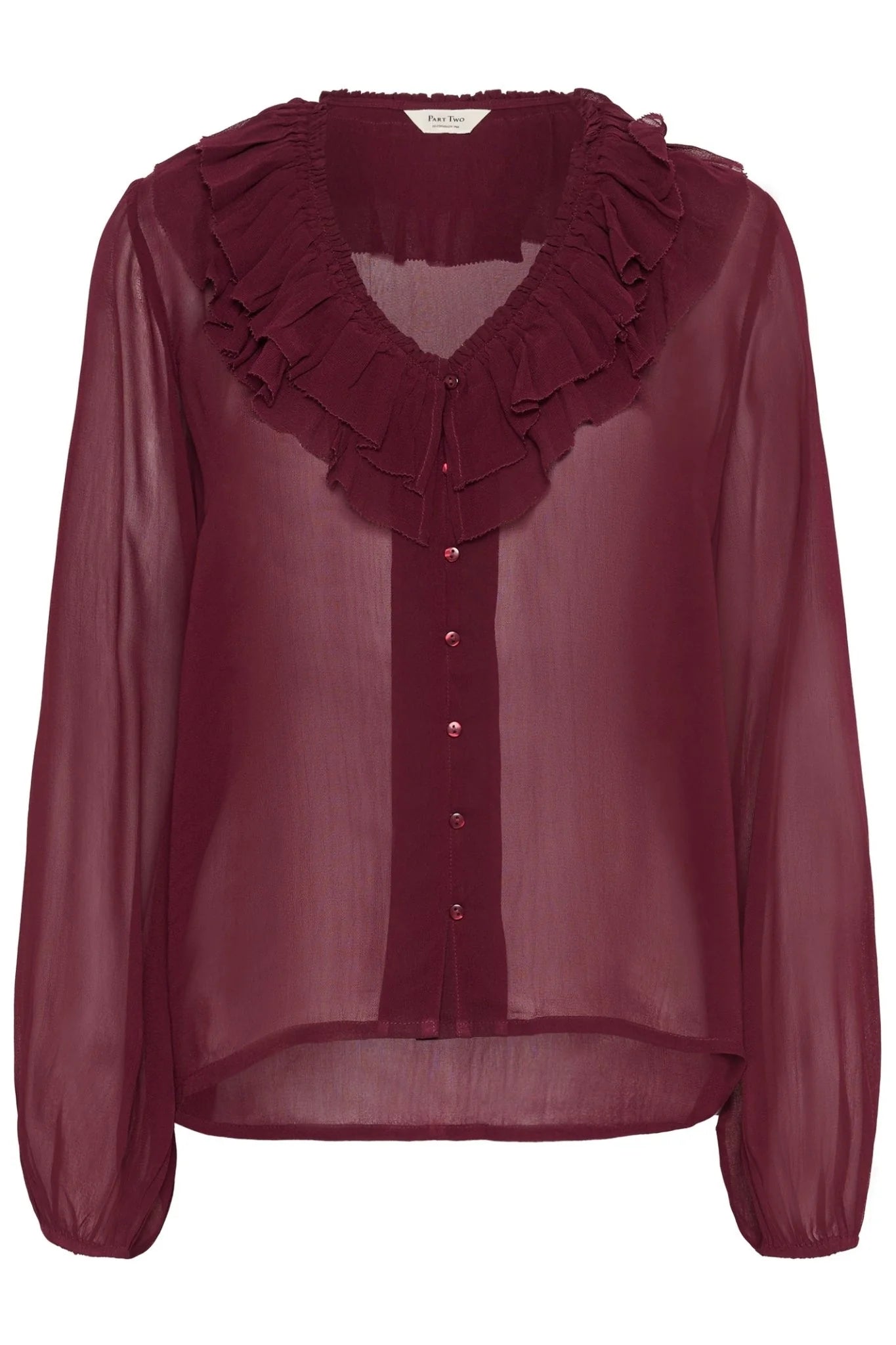 Add a touch of femininity to your wardrobe with this sheer blouse from Part Two. Designed with a subtle ruffle collar, front button fastening, and elasticated cuffs, it’s perfect for layering over a simple cami. The lightweight fabric makes it ideal for both work and weekend dressing. 100% viscose.