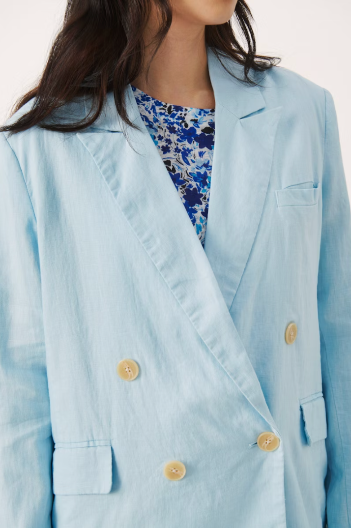 Double-breasted jacket with a classic collar and 2 piped pockets with flap on the front and a small one on the chest. Buttonhole at the cuffs and slit at the back at the bottom of the jacket