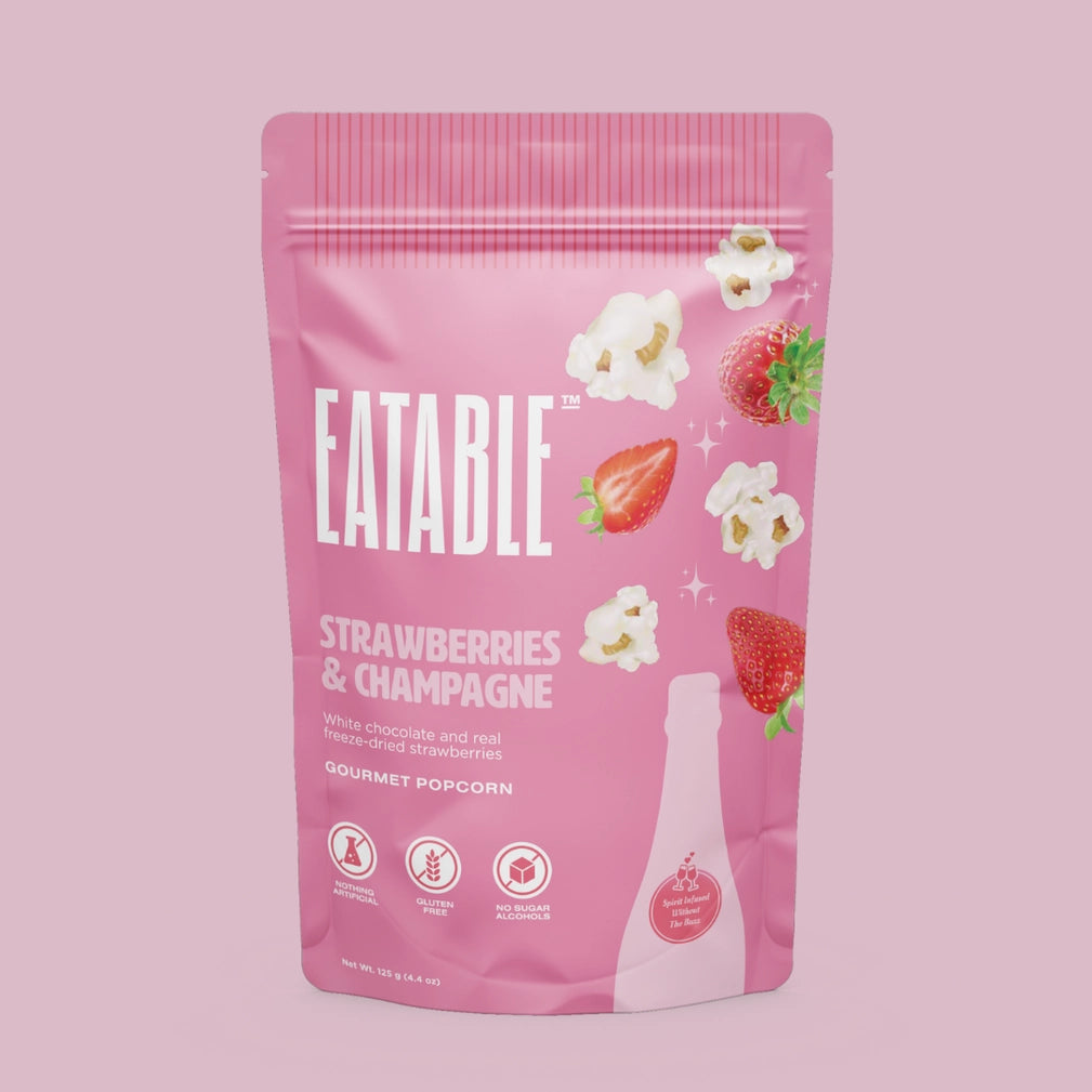 Strawberries & Champagne White Chocolate Popcorn combines gourmet popcorn with an enticing blend of white chocolate and real freeze-dried strawberries, topped with Champagne-flavored sugar crystals that pop with flavor. This whole-grain kettle popcorn offers a unique sensorial snacking experience that excites the palate. Crafted in small batches in Canada, this artisan popcorn is made from non-GMO, locally sourced kernels, ensuring a premium, health-conscious option for any gourmet snack lineup. It's completely vegetarian and gluten-free, made without any artificial colors or flavors, offering a natural choice for those seeking a luxurious, yet guilt-free treat.