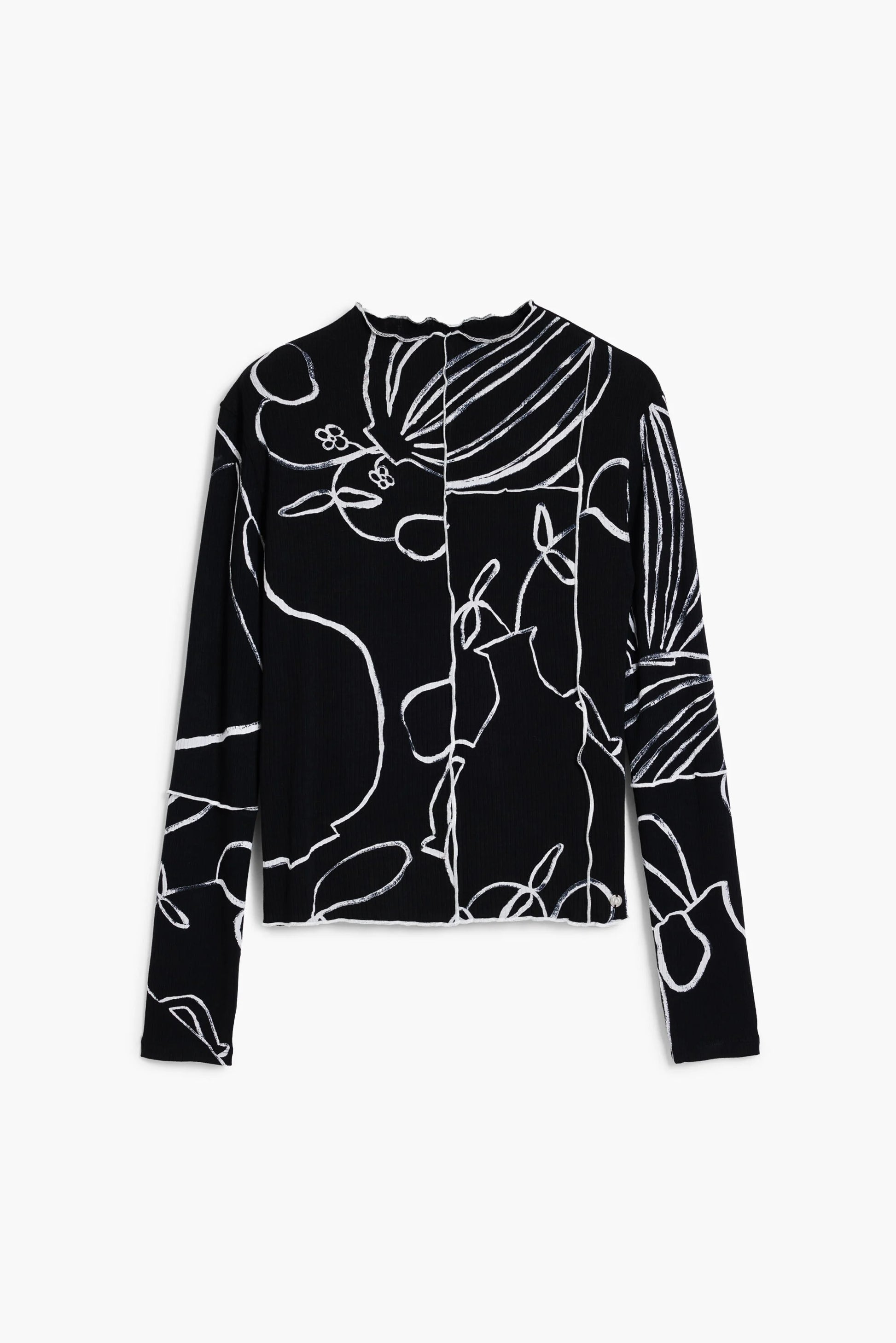 Ribbed long-sleeve T-shirt with a slightly raised neck, featuring contrasting rib seam details and a print of flower and vase silhouettes.
