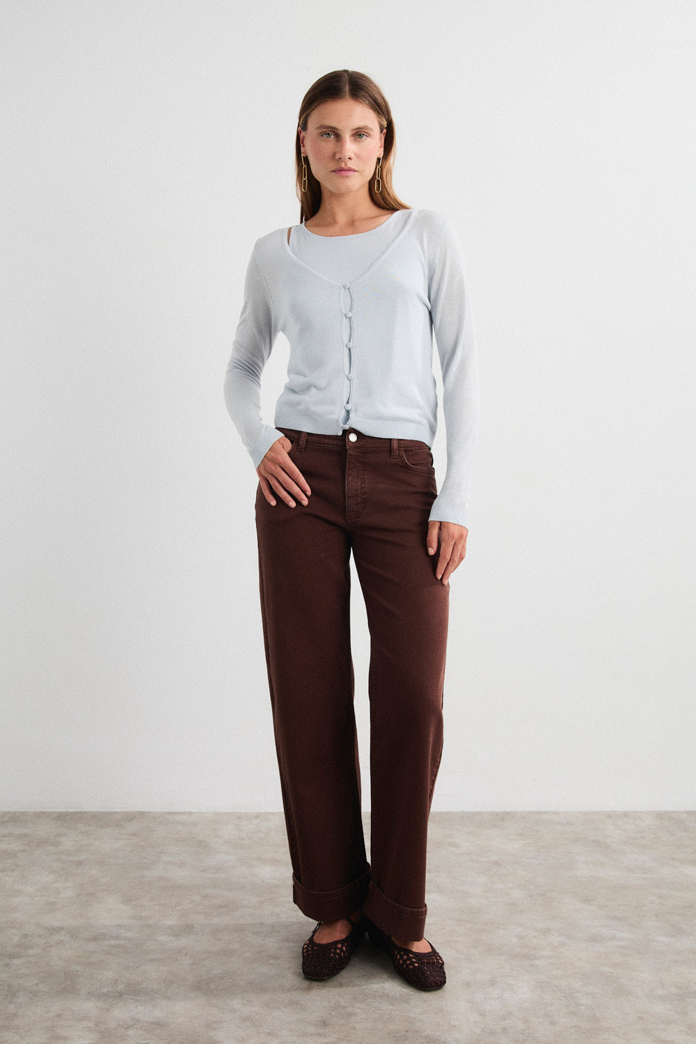 Low rise twill pants with wide leg and turn-up hem detail, classic pockets and five belt loops.