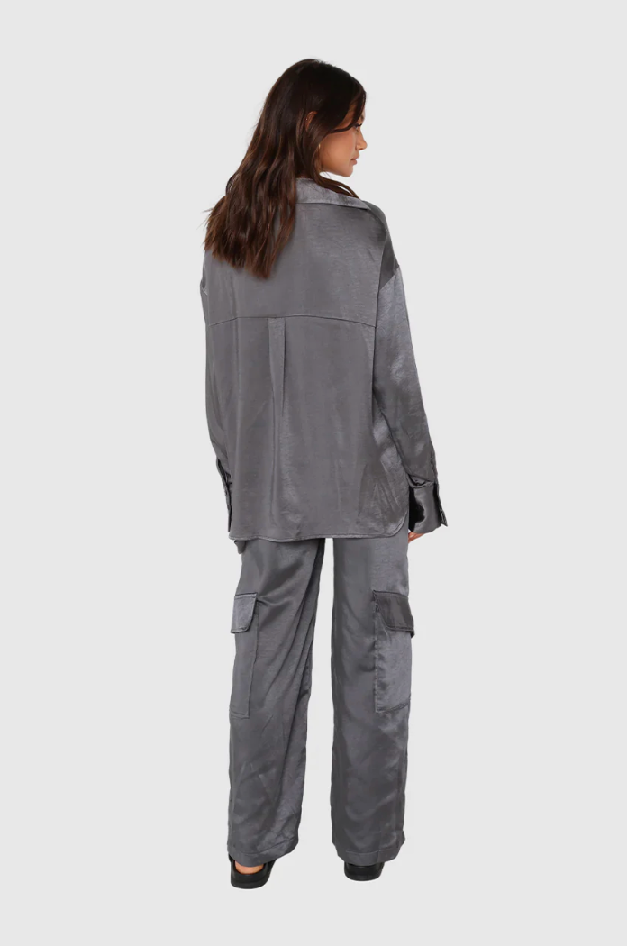 The Zura Satin Shirt offers a sleek and comfortable fit with a classic V-neckline and center front button closure. Made of soft satin fabric, this shirt also features a feature front pocket, all with a relaxed fit. Perfect for any occasion, the Zura Satin Shirt is a stylish go-to.